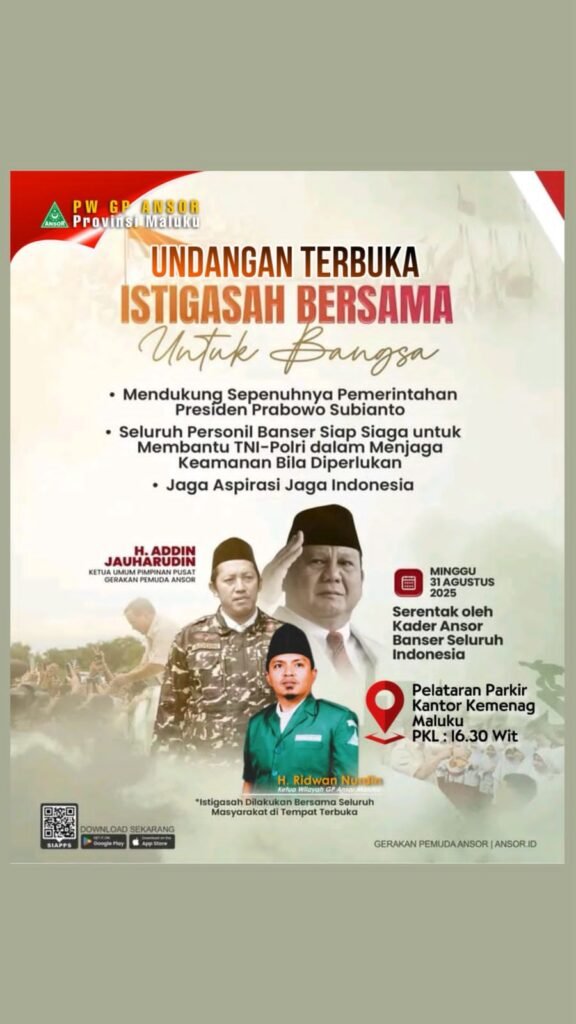 Ambon – Pimpinan Wilayah (PW) Gerakan Pemuda (GP) Ansor Maluku mengundang masyarakat luas untuk menghadiri Istighotsah Bersama untuk Bangsa yang akan digelar pada Minggu, 31 Agustus 2025, pukul 16.30 WIT di pelataran Kantor Kementerian Agama (Kemenag) Maluku.